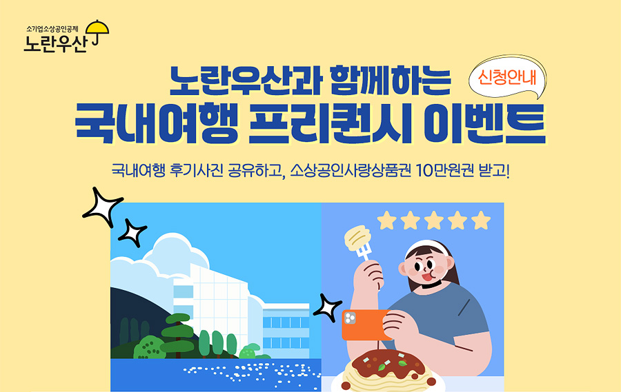 9월부터 노란우산 가입자분들을 위한 이벤트가 준비되어있습니다. 노란우산을 통해 국내여행 다녀오신 소중한 추억을 공유해주시고, 소상공인사랑상품권 10만 원권도 받아가세요!