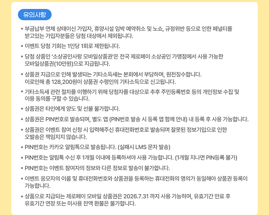 - 상품으로 지급되는 제로페이 모바일 상품권은 2026년 7월 31일까지 사용 가능하며, 유효기간 만료 후 유효기간 연장 또는 미사용 잔액 환불은 불가합니다.