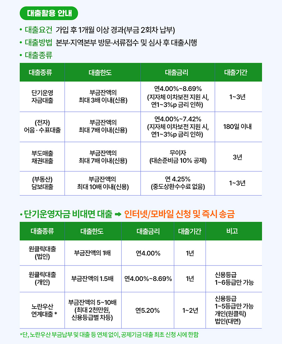 단기운영 자금대출 | 부금잔액의 최대 3배 이내(신용) | 연4.00%~8.69%(지자체 이차보전 지원 시, 연1~3%p 금리 인하) | 1~3년 |
