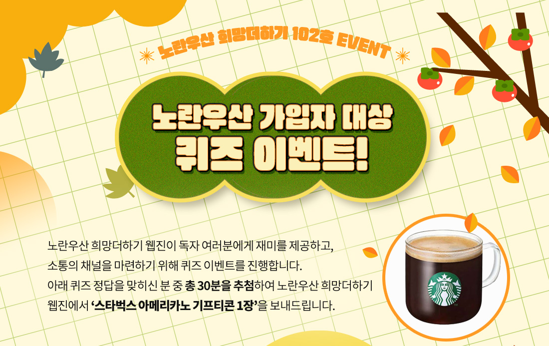 노란우산 희망더하기 웹진이 독자 여러분에게 재미를 제공하고, 소통의 채널을 마련하기 위해 퀴즈 이벤트를 진행합니다. 아래 퀴즈 정답을 맞히신 분 중 총 30분을 추첨하여 노란우산 희망더하기 웹진에서 스타벅스 아메리카노 기프티콘 1장을 보내드립니다.