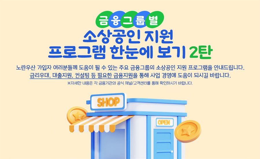 노란우산 가입자 여러분들께 도움이 될 수 있는 주요 금융그룹의 소상공인 지원 프로그램을 안내드립니다. 금리우대, 대출지원, 컨설팅 등 필요한 금융지원을 통해 사업 경영에 도움이 되시길 바랍니다. ※ 자세한 내용은 각 금융기관의 공식 채널/고객센터를 통해 확인하시기 바랍니다.