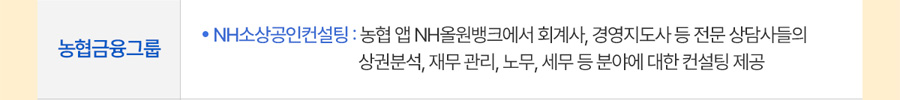 - NH소상공인컨설팅: 농협 앱 NH올원뱅크에서 회계사, 경여지도사 등 전문 상담사들의 상권분석, 재무관리, 노무, 세무 등 분야에 대한 컨설팅 제공