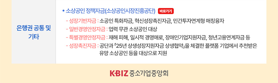 - - 특별경영안정자금: 재해 피해, 일시적 경영애로, 장애인기업지원자금, 청년고용연계자금 등