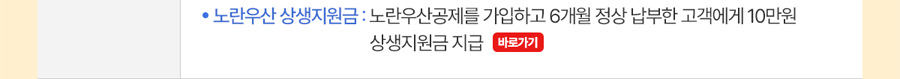 - 노란우산 상생지원금: 노란우산공제를 가입하고 6개월 정상 납부한 고객에게 10만 원 상생지원금 지급