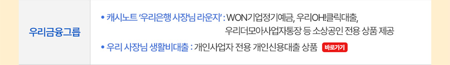 - 캐시노트 '우리은행 사장님 라운지': WON기업정기예금, 우리OH!클릭대출, 우리더모아사업자통장 등 소상공인 전용 상품 제공
