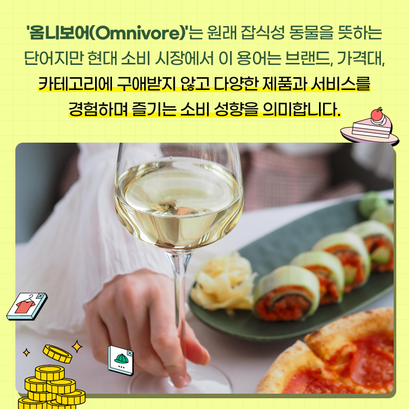 '옴니보어(Omnivore)'는 원래 잡식성 동물을 뜻하는 단어지만 현대 소비 시장에서 이 용어는 브랜드, 가격대, 카테고리에 구애받지 않고 다양한 제품과 서비스를 경험하며 즐기는 소비 성향을 의미합니다.