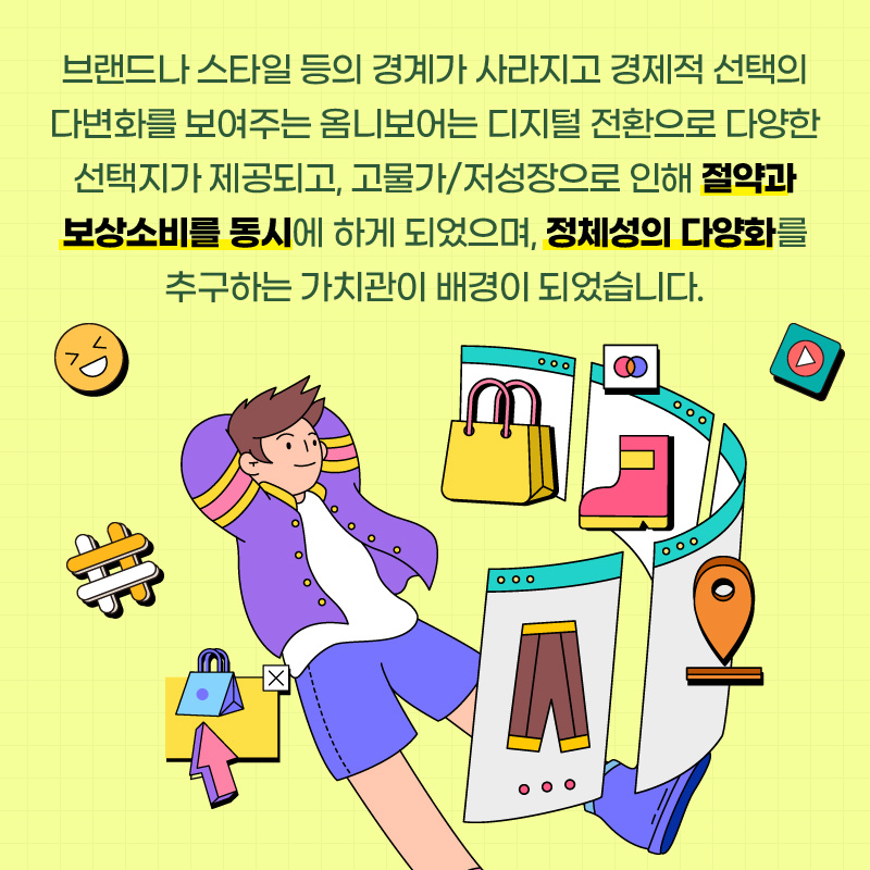브랜드나 스타일 등의 경계가 사라지고 경제적 선택의 다변화를 보여주는 옴니보어는 디지털 전환으로 다양한 선택지가 제공되고, 고물가/저성장으로 인해 절약과 보상소비를 동시에 하게 되었으며, 정체성의 다양화를 추구하는 가치관이 배경이 되었습니다.
