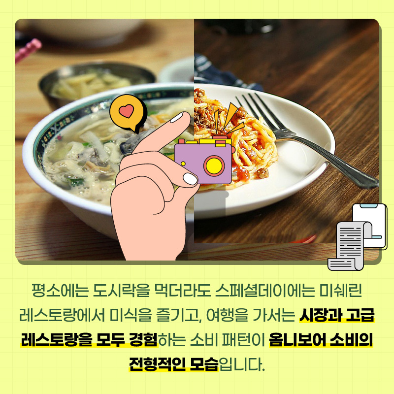 평소에는 도시락을 먹더라도 스페셜데이에는 미쉐린 레스토랑에서 미식을 즐기고, 여행을 가서는 시장과 고급 레스토랑을 모두 경험하는 소비 패턴이 옴니보어 소비의 전형적인 모습입니다.