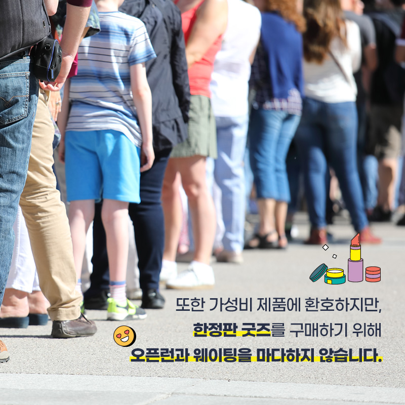 또한 가성비 제품에 환호하지만, 한정판 굿즈를 구매하기 위해 오픈런과 웨이팅을 마다하지 않습니다.
