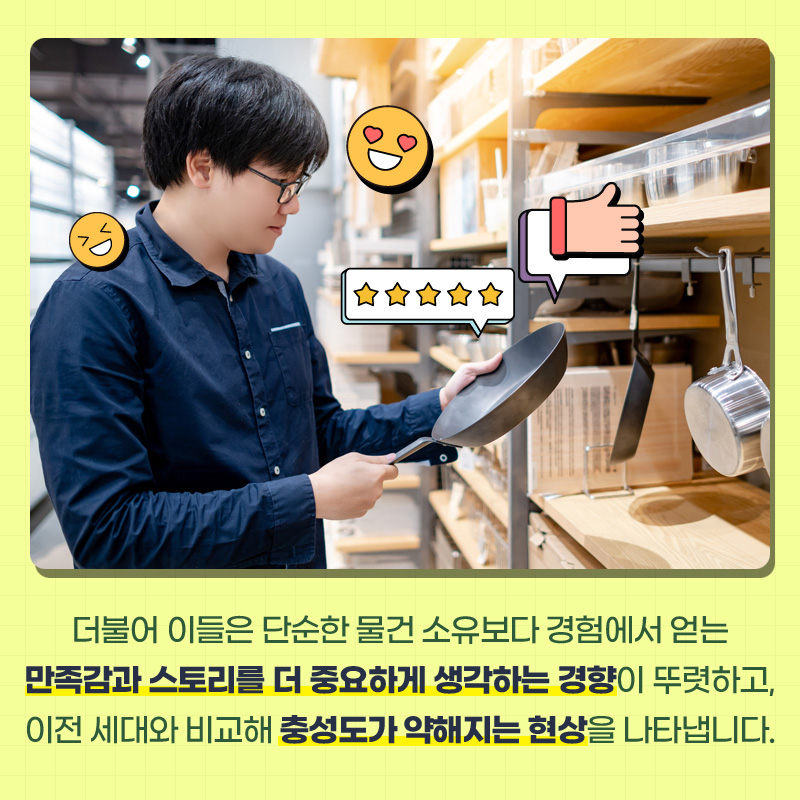 더불어 이들은 단순한 물건 소유보다 경험에서 얻는 만족감과 스토리를 더 중요하게 생각하는 경향이 뚜렷하고, 이전 세대와 비교해 충성도가 약해지는 현상을 나타냅니다.