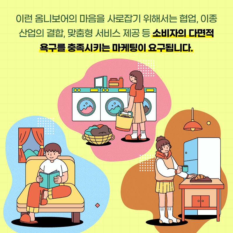 이런 옴니보어의 마음을 사로잡기 위해서는 협업, 이종 산업의 결합, 맞춤형 서비스 제공 등 소비자의 다면적 욕구를 충족시키는 마케팅이 요구됩니다.