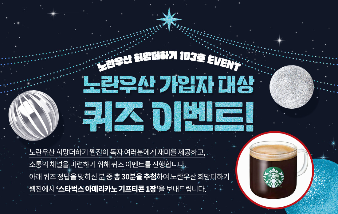 노란우산 희망더하기 웹진이 독자 여러분에게 재미를 제공하고, 소통의 채널을 마련하기 위해 퀴즈 이벤트를 진행합니다. 아래 퀴즈 정답을 맞히신 분 중 총 30분을 추첨하여 노란우산 희망더하기 웹진에서 스타벅스 아메리카노 기프티콘 1장을 보내드립니다.