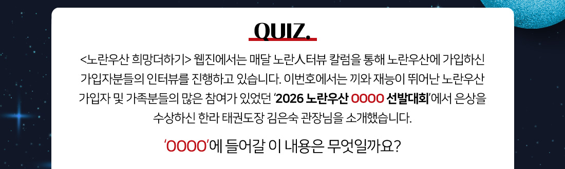 <노란우산 희망더하기> 웹진에서는 매달 노란인터뷰 칼럼을 통해 노란우산에 가입하신 가입자분들의 인터뷰를 진행하고 있습니다. 이번호에서는 끼와 재능이 뛰어난 노란우산 가입자 및 가족들의 많은 참여가 있었던 '2026 노란우산 OOOO 선발대회'에서 은상을 수상하신 한라 태권도장 김은숙 관장님을 소개했습니다. 'OOOO'에 들어갈 이 내용은 무엇일까요?
