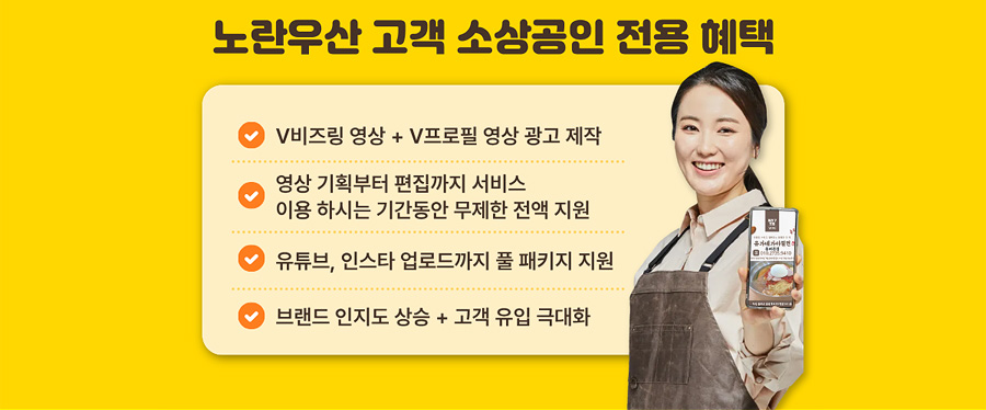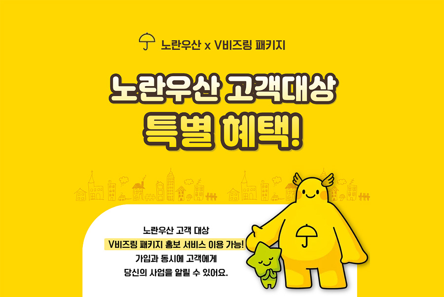 노란우산 고객 대상 V비즈링 패키지 홍보 서비스 이용가능! 가입과 동시에 고객에게 당신의 사업을 알릴 수 있어요.