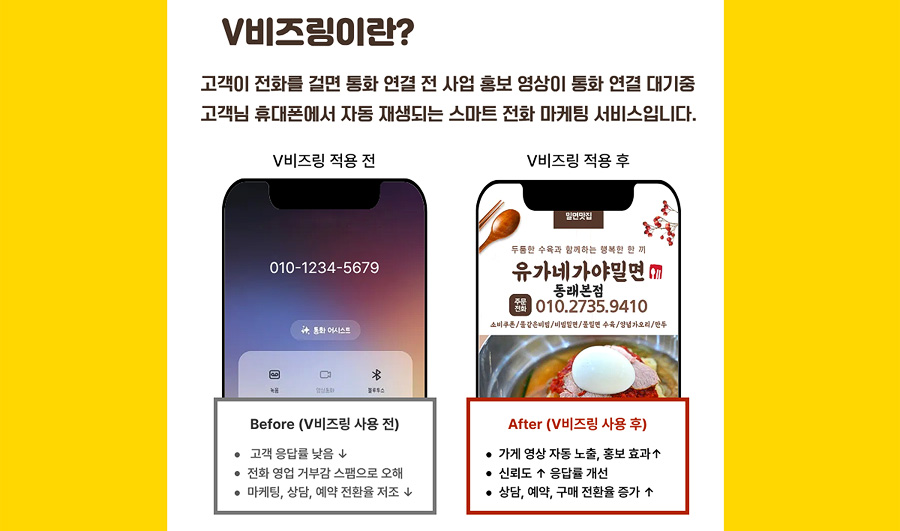 사장님께서 고객님 휴대폰으로 전화를 걸때 통화 연결 중 고객님 휴대폰에 사업 홍보 영상이 송풀되는 마케팅 서비스 입니다. "요즘 누가 모르는 번호 받아요?" 가입 즉시 통화에서 홍보 노출 가능! 고객과 통화 연결 중 짧은 영상으로 사업소개, 인사말, 매장, 제품 등 영상을 시각적으로 전달, 신뢰감 상승 효과!