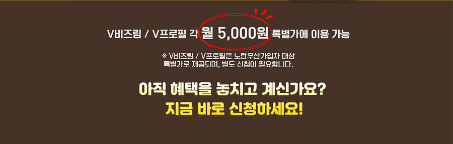 V비즈링 / V프로필 각 월 5,000원 특별가에 이용 가능 ※ V비즈링 / V프로필은 노란우산가입자 대상 특별가로 제공되며, 별도 신청이 필요합니다. 아직 혜택을 놓치고 계신가요? 지금 바로 신청하세요!