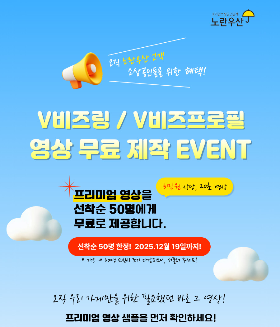 5만 원 상당의 영상 제작 무료 이벤트는 기간 내 50명 소진시 조기 마감되오니, 서둘러 주세요!