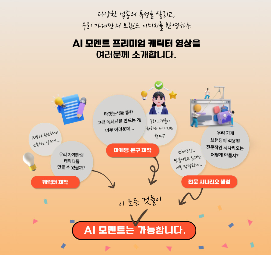 캐릭터 제작: 고객과 친근하게 소통하고 싶은데..., 우리 가게만의 캐릭터를 만들 수 있을까? 마케팅 문구 제작: 타겟분석을 통한 고객 메시지를 만드는 게 너무 어려운데..., 우리 고객들이 원하는 메시지는 뭘까? 전문 시나리오 생성: 쇼츠 영상 만들어보고 싶지만 너무 막막한데..., 우리 가게 브랜딩이 적용된 전문적인 시나리오는 어떻게 만들지? 이 모든 것들이 AI 모멘트는 가능합니다.