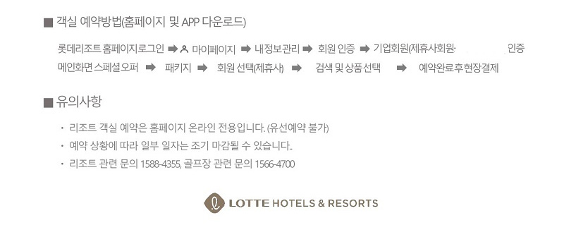 롯데리조트 홈페이지 로그인 → 마이페이지 → 내정보관리 → 회원인증 → 기업회원(제휴사회원 인증) 메인화면 스페셜 오퍼 → 패키지 → 회원 선택(제휴사) → 검색 및 상품 선택 → 예약 완료 후 현장결제