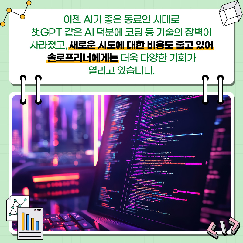 이젠 AI가 좋은 동료인 시대로 챗GPT 같은 AI 덕분에 코딩 등 기술의 장벽이 사라졌고, 새로운 시도에 대한 비용도 줄고 있어 솔로프리너에게는 더욱 다양한 기회가 열리고 있습니다.