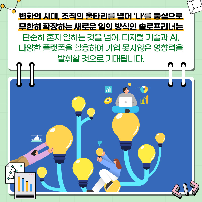변화의 시대, 조직의 울타리를 넘어 '나'를 중심으로 무한히 확장하는 새로운 일의 방식인 솔로프리너는 단순히 혼자 일하는 것을 넘어, 디지털 기술과 AI, 다양한 플랫폼을 활용하여 기업 못지않은 영향력을 발휘할 것으로 기대됩니다.