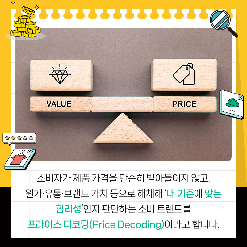 소비자가 제품 가격을 단순히 받아들이지 않고, 원가·유통·브랜드 가치 등으로 해체해 '내 기준에 맞는 합리성'인지 판단하는 소비 트렌드를 프라이스 디코딩(Price Decoding)이라고 합니다.
