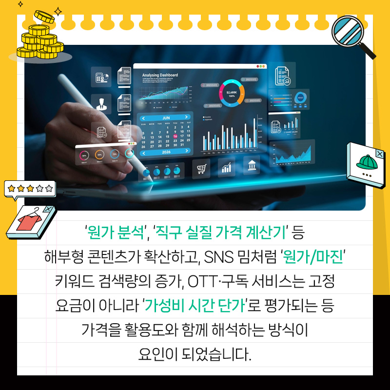 '원가 분석', '직구 실질 가격 계산기' 등 해부형 콘텐츠가 확산하고, SNS 밈처럼 '원가/마진' 키워드 검색량의 증가, OTT·구독 서비스는 고정 요금이 아니라 '가성비 시간 단가'로 평가되는 등 가격을 활용도와 함께 해석하는 방식이 요인이 되었습니다.