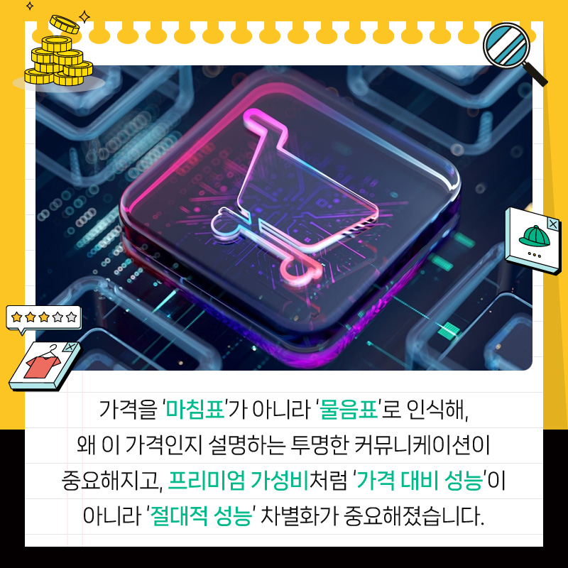 가격을 '마침표'가 아니라 '물음표'로 인식해, 왜 이 가격인지 설명하는 투명한 커뮤니케이션이 중요해지고, 프리미엄 가성비처럼 '가격 대비 성능'이 아니라 '절대적 성능' 차별화가 중요해졌습니다.