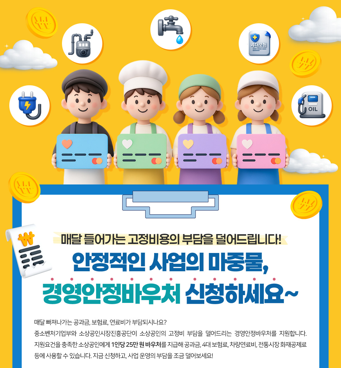 매달 빠져나가는 공과금, 보험료, 연료비가 부담되시나요? 중소벤처기업부와 소상공인시장진흥공단이 소상공인의 고정비 부담을 덜어드리는 경영안정바우처를 지원합니다. 지원요건을 충족한 소상공인에게 1인당 25만 원 바우처를 지급해 공과금, 4대 보험료, 차량연료비, 전통시장 화재공제료 등에 사용할 수 있습니다. 지금 신청하고, 사업 운영의 부담을 조금 덜어보세요!