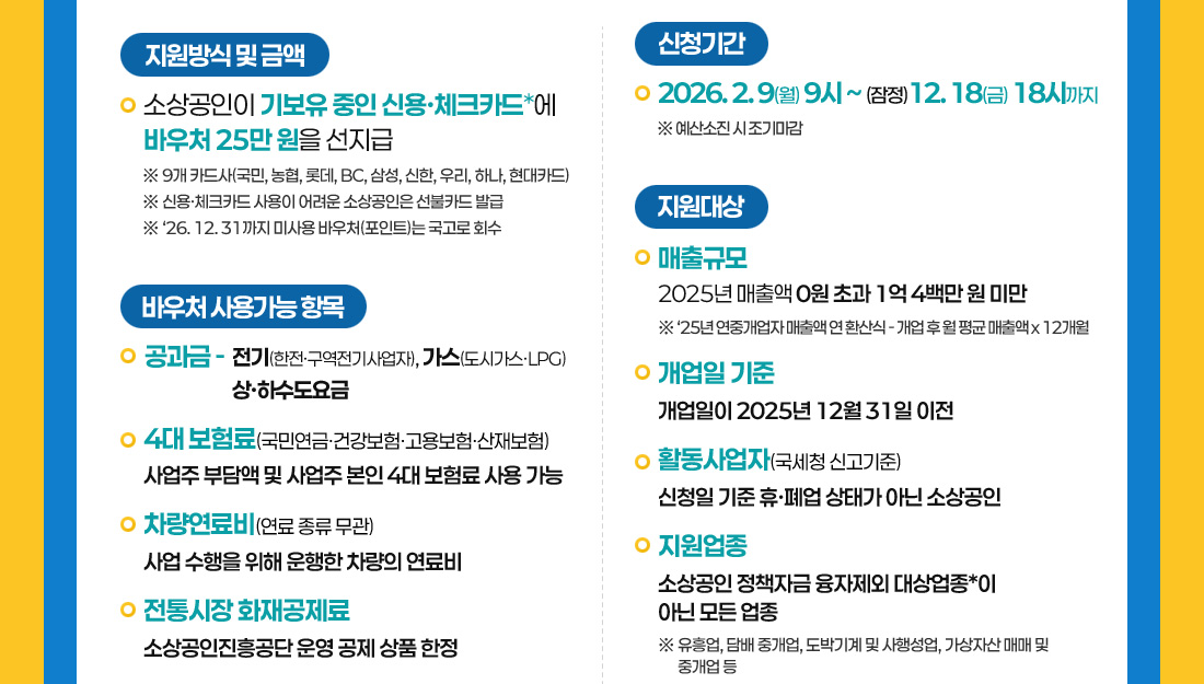- 소상공인이 기보유 중인 신용·체크카드*에 바우처 25만 원 선지급