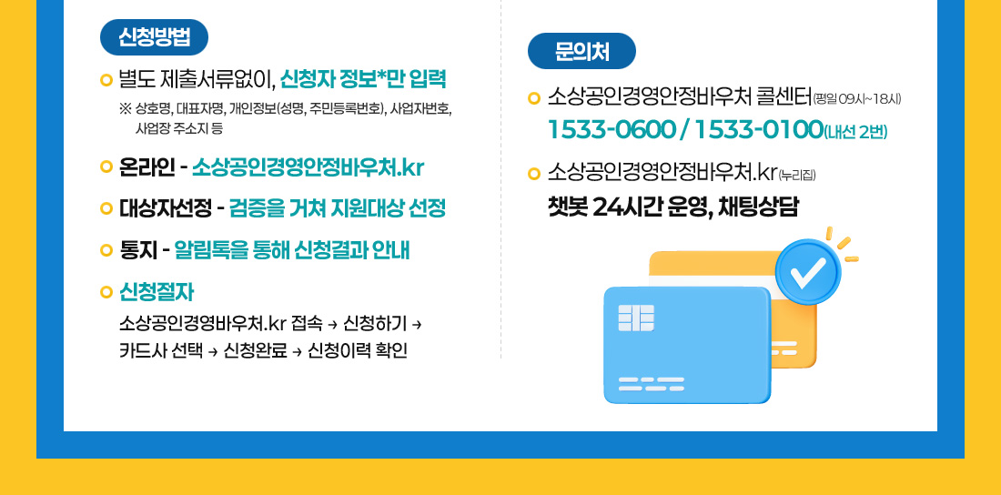 - 신청절자: 소상공인경영바우처.kr 접속 → 신청하기 → 카드사 선택 → 신청완료 → 신청이력 확인