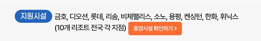 - 지원시설: 금호, 디오션, 롯데, 리솜, 비체팰리스, 소노, 용평, 켄싱턴, 한화, 휘닉스(10개 리조트 전국 각 지점) 휴양시설 확인하기!