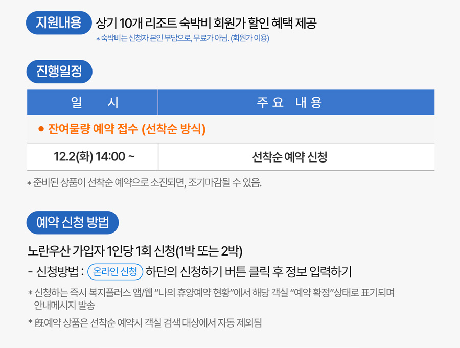 - 지원내용: 상기 10개 리조트 숙박비 회원가 할인 혜택 제공 *숙박비는 신청자 본인 부담으로 무료가 아닙니다(회원가 이용).