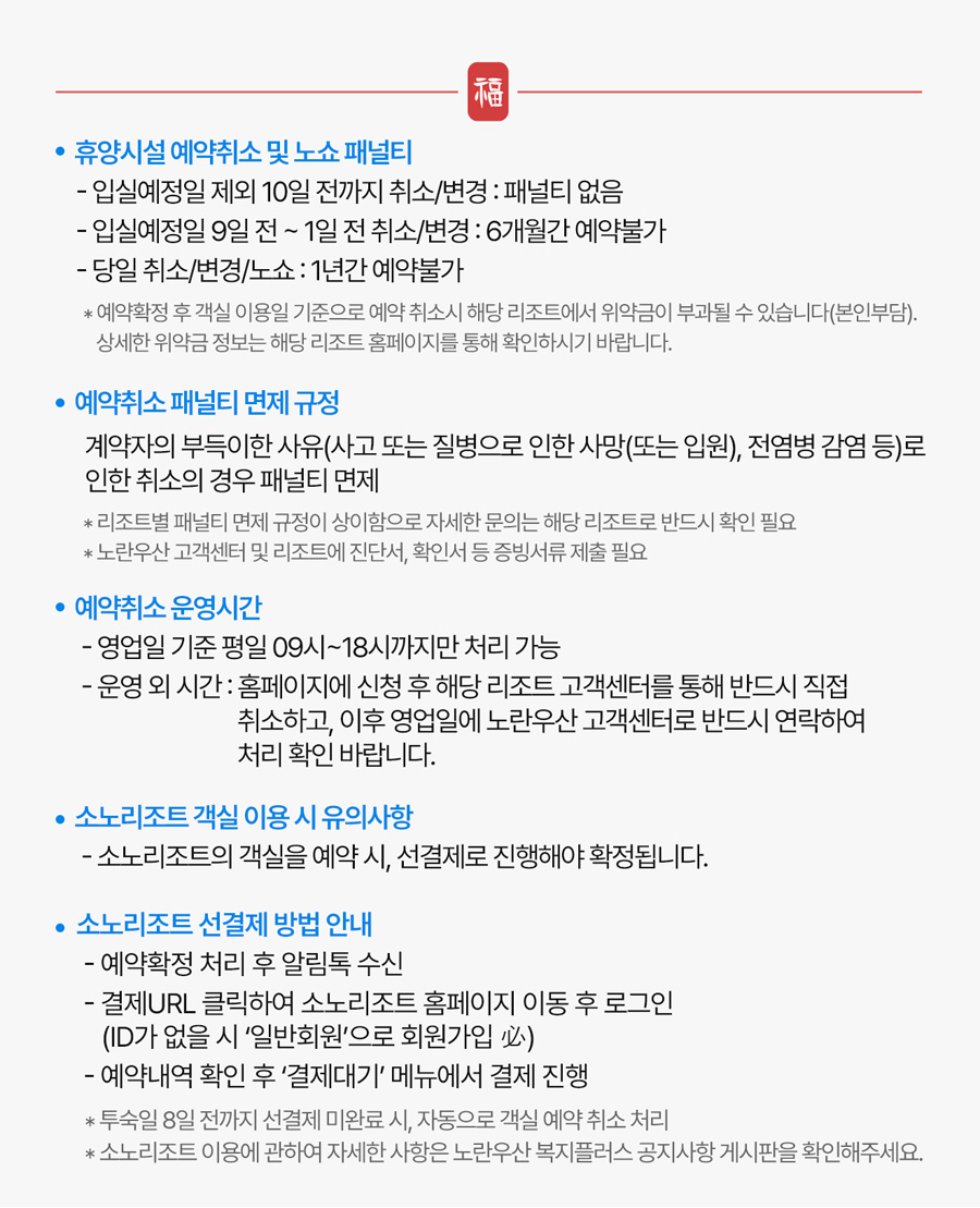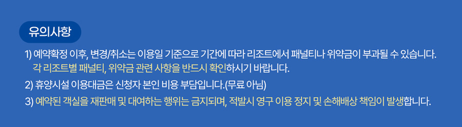 - 1) 예약확정 이후, 변경/취소는 이용일 기준으로 기간에 따라 리조트에서 패널티나 위약금이 부과될 수 있습니다. 각 리조트별 패널티, 위약금 관련 사항을 반드시 확인하시기 바랍니다.