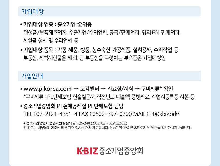 - Tel: 02-2124-4351~4, Fax: 0502-397-0200, Mail: PL@kbiz.or.kr