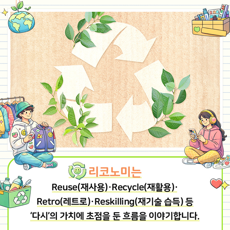 리코노미는 Reuse(재사용)·Recycle(재활용)·Retro(레트로)·Reskilling(재기술 습득) 등 '다시'의 가치에 초점을 둔 흐름을 이야기합니다.