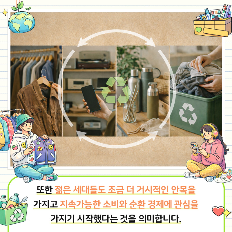 또한 젊은 세대들도 조금 더 거시적인 안목을 가지고 지속가능한 소비와 순환 경제에 관심을 가지기 시작했다는 것을 의미합니다.