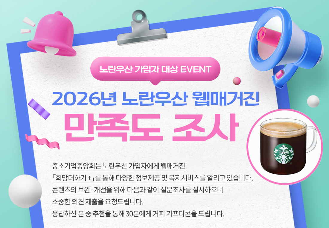 중소기업중앙회는 노란우산 가입자에게 웹매거진 「희망더하기 +」를 통해 다양한 정보제공 및 복지서비스를 알리고 있습니다. 콘텐츠의 보완·개선을 위해 다음과 같이 설문조사를 실시하오니 소중한 의견 제출을 요청드립니다. 응답하신 분 중 추첨을 통해 30분에게 커피 기프티콘을 드립니다.